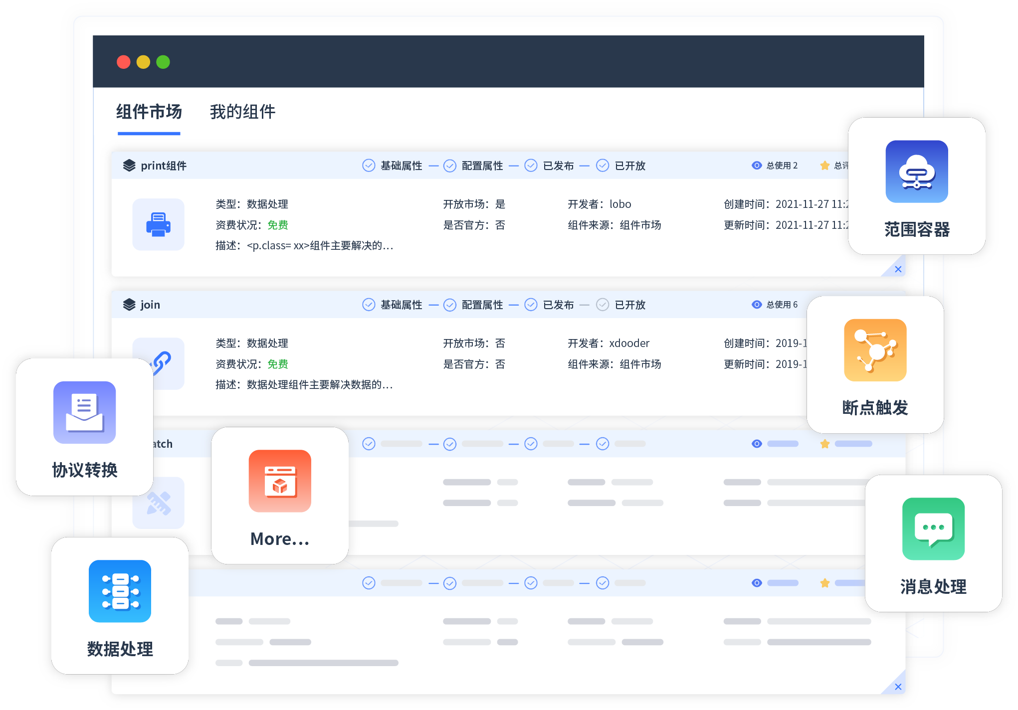 针对集成场景,,,,NO钱包提供组件市场,,例如协议转换、、、消息处理、、、文件操作等。。。除平台提供的组件外,,,,客户可以自定义所需组件。。