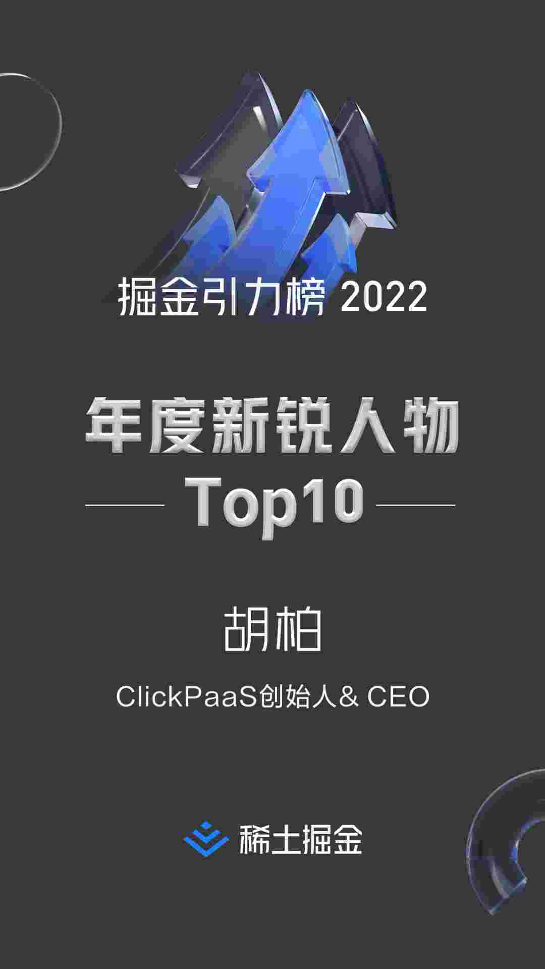 2022年1月6日,,,稀土掘金社区第一届「掘金未来大会」成功举办,,,会上发布了“2022 稀土掘金引力榜 年度新锐人物”榜单,,上海爱湃斯科技有限公司(简称NO钱包)创始人及CEO胡柏实力入选年度新锐人物TOP 10。。
